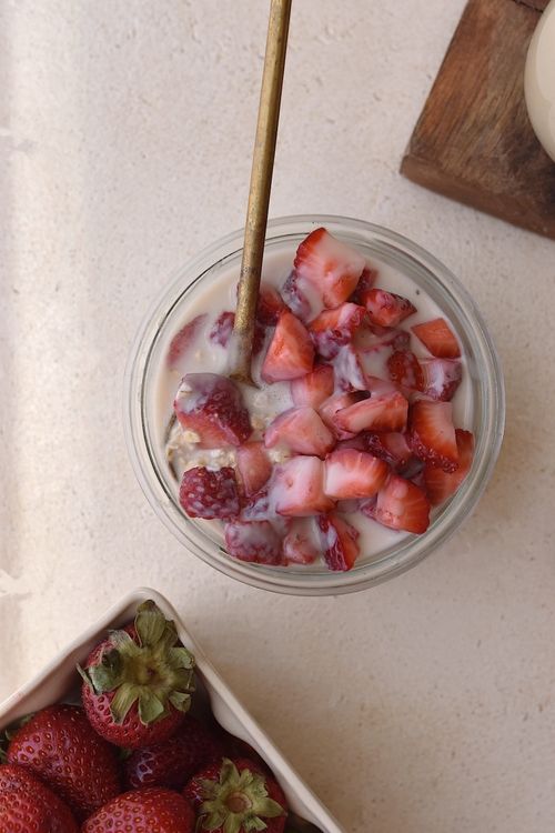 I love prepping overnight oats at least a couple times a week to help me more easily get my day started. I’ve experimented with so many different overnight oat recipes including some with peanut butter, bananas, and so many berries, but I was craving something with a bit of a sweeter touch. After trying out fresas con crema in my overnight oats, I now have my favorite go-to recipe! It’s so yummy, you’ll be wanting to prep this multiple times a week like me!