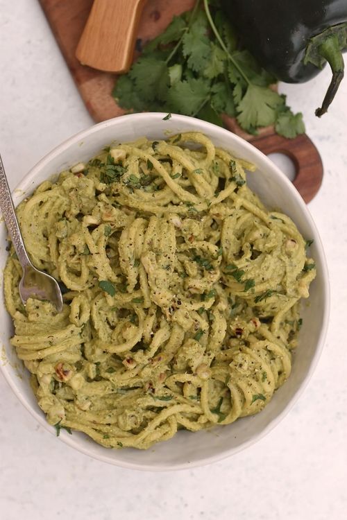Vegan Espagueti Verde, or creamy poblano pepper pasta, is so delicious. It's the perfect combination of Italian and Mexican!